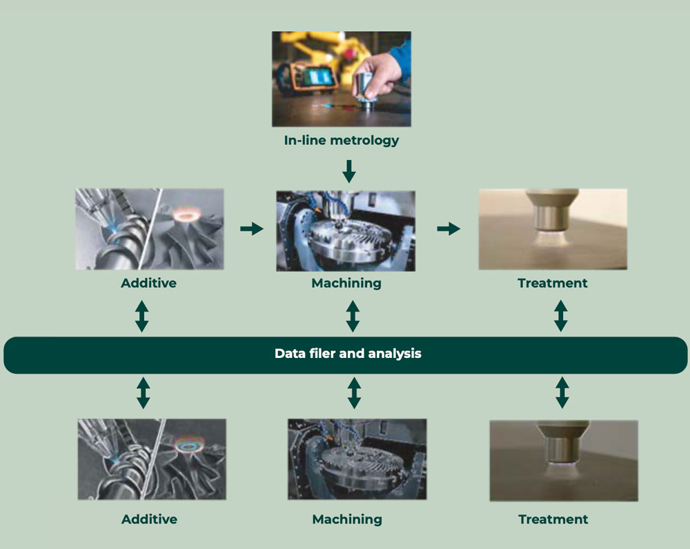 Hybrid remanufacturing combines traditional manufacturing (using new materials) with remanufacturing (restoring used products) in a single system, thereby aiming for increased sustainability, cost reduction, and maximal critical material reuse. Theme 3 combines manufacturing processes with in-process metrology for developing targeted remanufacturing interventions and identifying the physical processes best suited to reconstitute materials to like-new conditions despite accidental damage, wear and tear, and material property changes, such as hardening or contamination.